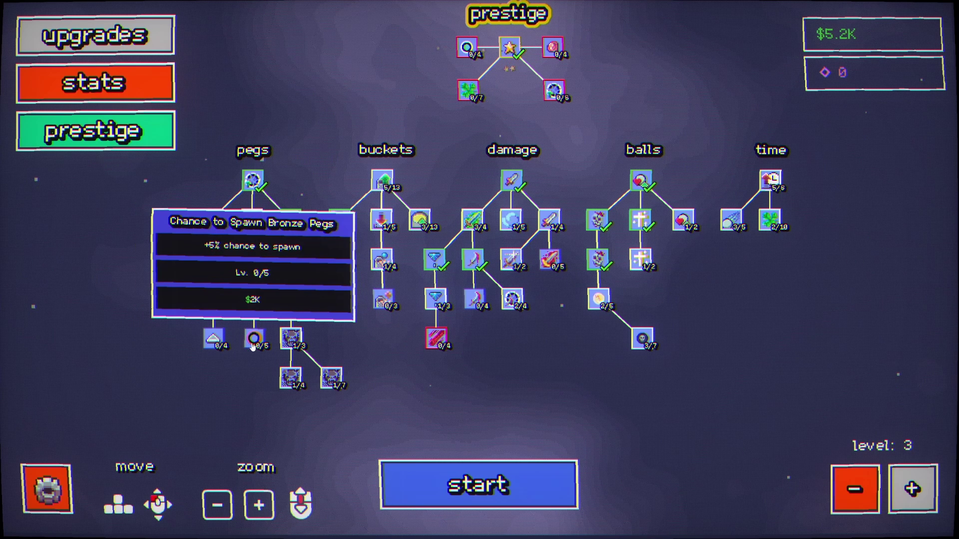also that's not how 5% works)The pegs having just barely a sliver of health left (visually) made me feel encouraged to try to get the expensive (but paltry-looking) 5% damage upgrades, but as you can see above, only the very first upgrade I purchased increased my clear rate and there's no other flat damage upgrades in sight yet to help me 1-shot the (presumably) 4 HP pegs.